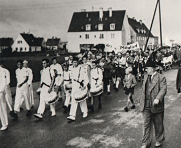 Historische Fotoaufnahmen aus dem Stadtteil (Kirche im Jahr 1946, Siedlerhof, Platzeinweihung der Spvgg Bärenkeller)